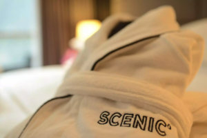 The bedroom area has a Queen-size Scenic 'Slumber bed' with Egyptian cotton linen and pillow menu. The bathroom with shower, is well stocked with L'Occitaine toiletries as well as a hairdryer, bathrobes and slippers. The suite also contains a complimentary in-suite mini-bar, restocked daily. The suite has a Flat screen HDTV linked to Mac Mini, complementary WiFi and use of a telephone. A safe is also provided for your valuables.